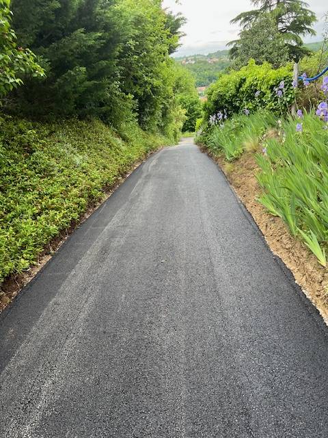 Rendu final d'un goudronnage en enrobé à chaud noir d'un chemin d'accès près de Lyon