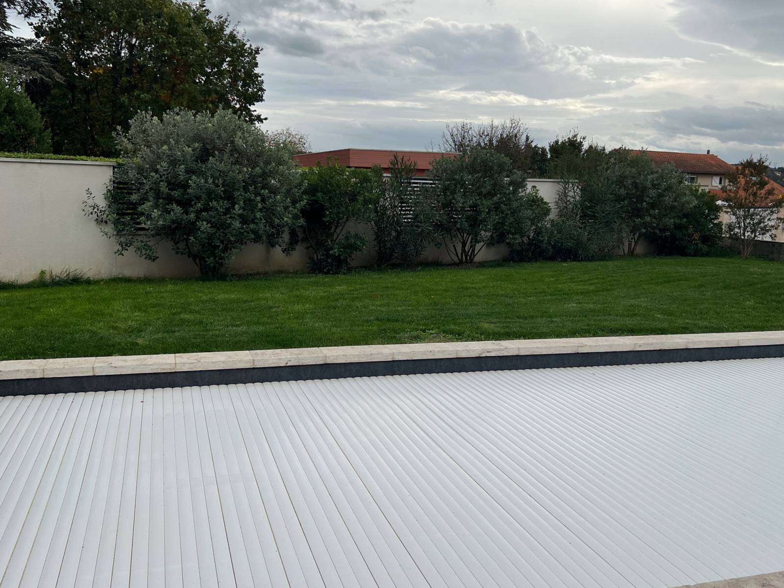 GRANITE TP a réalisé l'ensemble des aménagements extérieurs : clôtures, entrée, allée, espaces verts, terrasse et piscine d'une maison individuelle à Chaponnay.