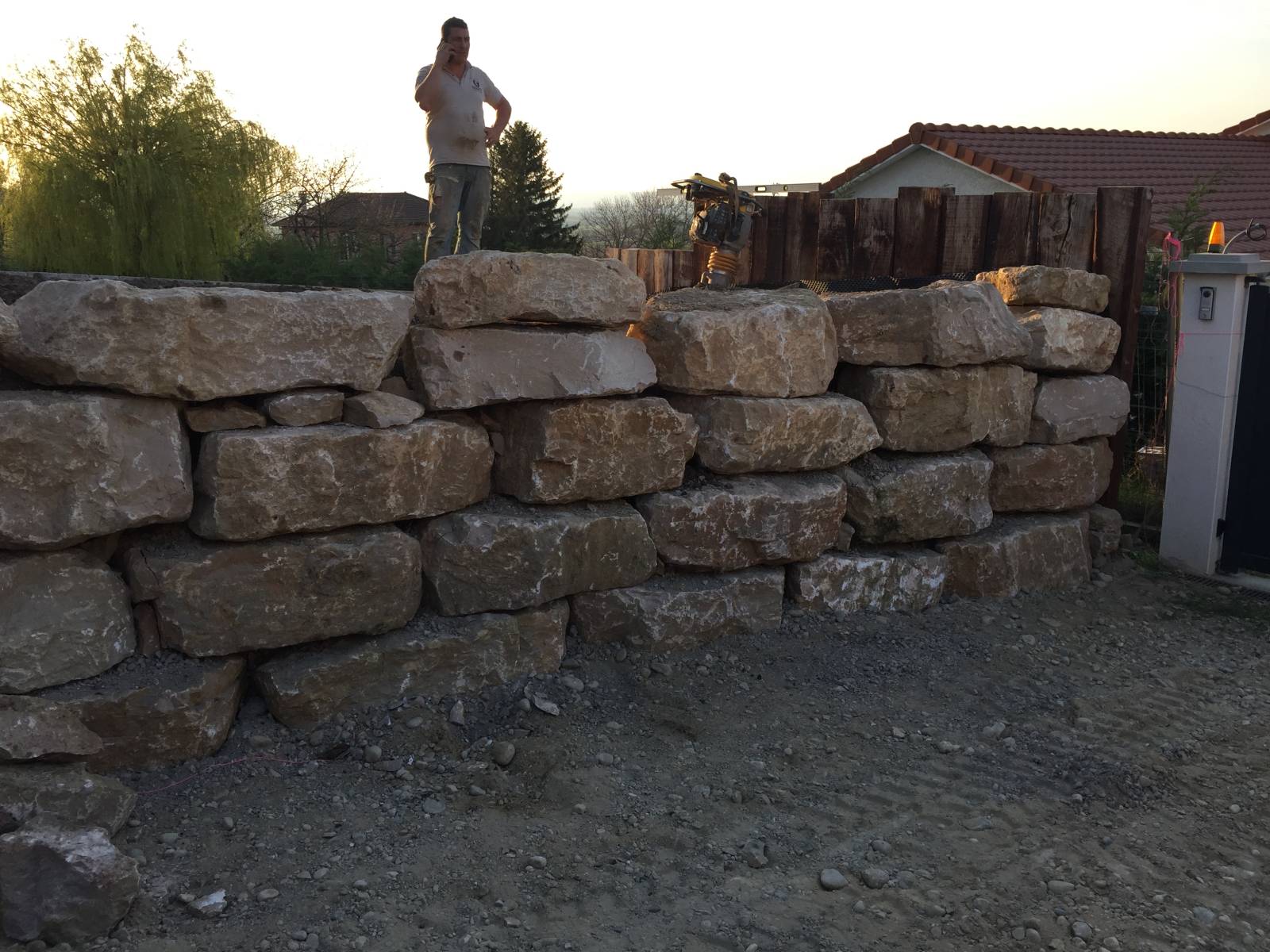 - création d'une allée à l'arrière de la maison avec notamment un mur de soutènement en enrochement et bordures pavé pour accueillir des plantes en pied du mur