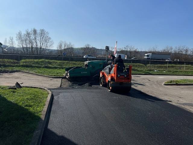 Pour cela, nos propres équipes ont travaillé sur l’intégralité du chantier : de la préparation à la couche de finition en enrobé. Notamment, le décapage des anciens enrobés de toute la surface et l’évacuation de ces derniers, la préparation de la surface en mettant en œuvre la couche de réglage en 0/31.5, la dépose des anciennes bordures et la pose les nouvelles, la pose des regards nécessaires.