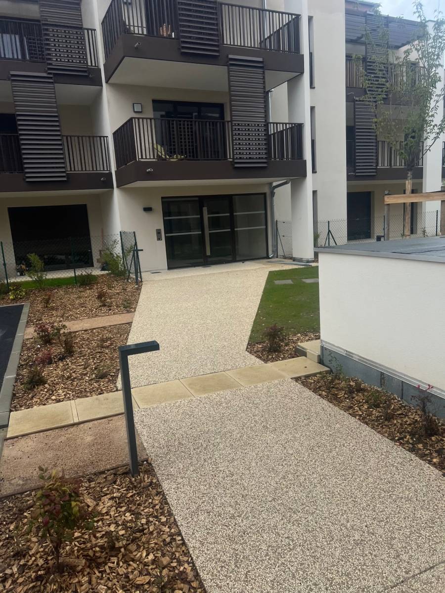 GRANITE TP a réalisé la mise en œuvre de béton désactivé pour les accès et les allées d'un immeuble d'habitation à Sathonay-Camp, dans la région lyonnaise (69).  Le béton désactivé a été choisi dans l'aménagement des extérieurs de cet immeuble pour différencier les voies circulables en enrobé, ...